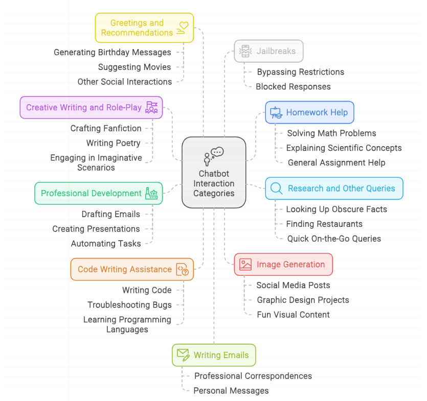 Chatbots are also used for generating greetings and providing recommendations. Whether it’s coming up with the perfect birthday message or suggesting the next movie to watch, this category reflects the social aspect of chatbot usage.